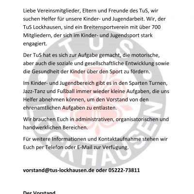 Liebe Vereinsmitglieder, Eltern und Freunde des TuS, wir suchen Helfer für unsere Kinder- und Jugendarbeit. Wir, der TuS Lockhausen, sind ein Breitensportverein mit über 700 Mitgliedern, der sich im Kinder- und Jugendsport stark engagiert.