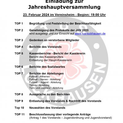 Liebe TuS Mitglieder, am 23. Februar steht die diesjährige Jahreshauptversammlung an. Der Vorstand lädt hierzu alle Mitglieder in unser Vereinsheim ein. Beginn ist am 23.02.2024 um 19 Uhr.