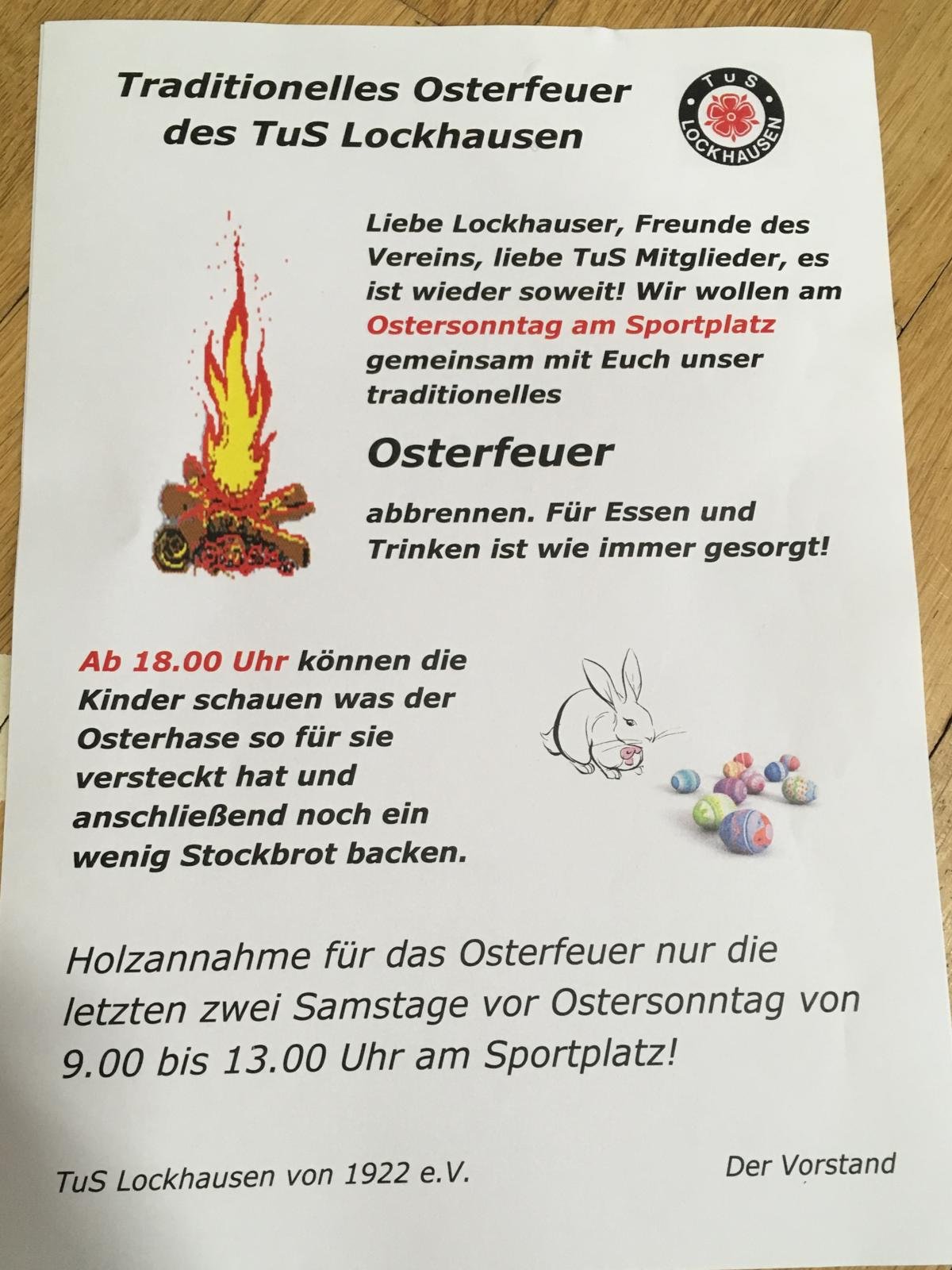 Osterfeuer 2019 13.04.2019 Uhr Allgemein Traditionelles Osterfeuer des TuS Lockhausen am Sonntag, den 21. April ab 18:00 Uhr.