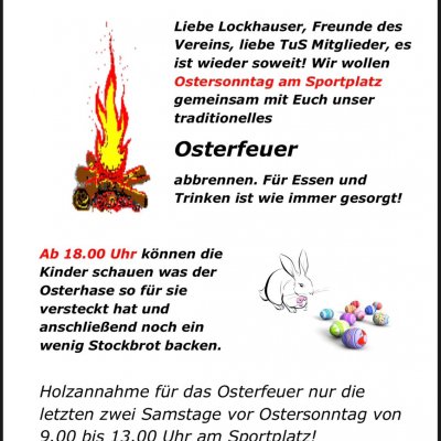 Liebe Lockhauser, Freunde des Vereins, liebe TuS Mitglieder, es ist wieder soweit! Wir wollen Ostersonntag am Sportplatz gemeinsam mit Euch unser traditionelles Osterfeuer abbrennen. Für Essen und Trinken ist wie immer gesorgt!