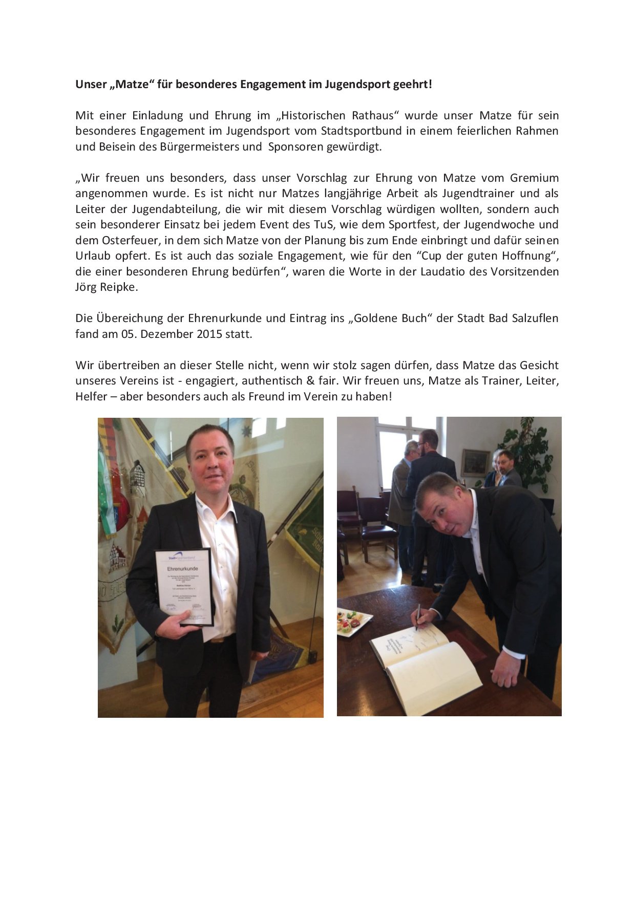 Unser "Matze" für besonderes Engagement im Jugendsport geehrt! 05.12.2015 Uhr Allgemein Ehrung MatzeUnser "Matze" für besonderes Engagement im Jugendsport geehrt!
